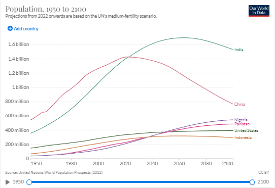 미국, 나이지리아, 파키스탄, 인도네시아는 인도 다음으로 인구가 많은 국가이며 2050년까지 이 자리를 지킬 것으로 예상됩니다. 현재 합산 인구는 인도와 중국 전체 인구의 절반도 되지 않습니다.