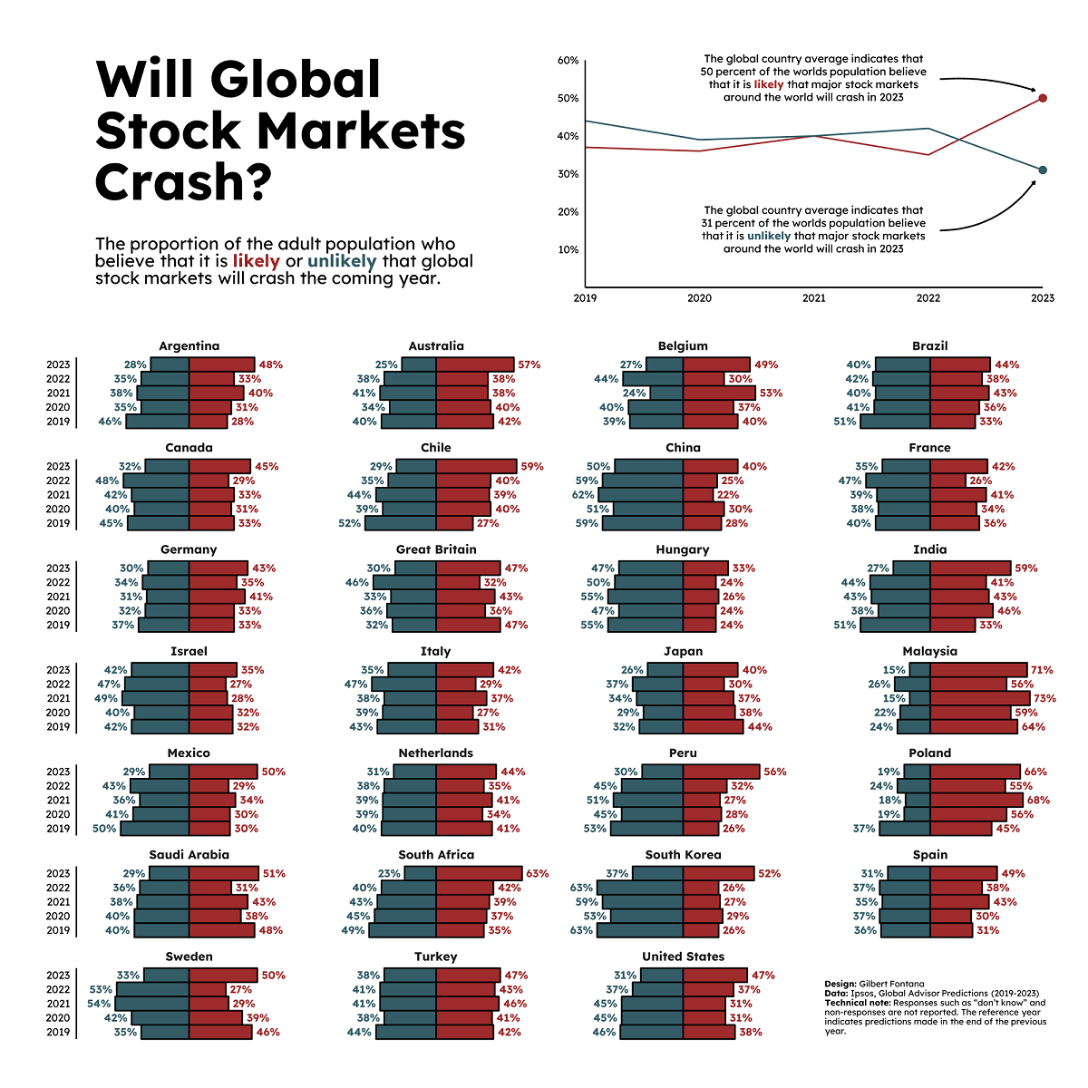 2019~2023년 Ipsos Global Advisor Predictions 설문조사의 데이터를 사용하여 글로벌 주식 시장이 내년에 폭락할 것이라고 생각하는 일반 시민의 비율을 표시합니다. (우리나라도 있습니다)
