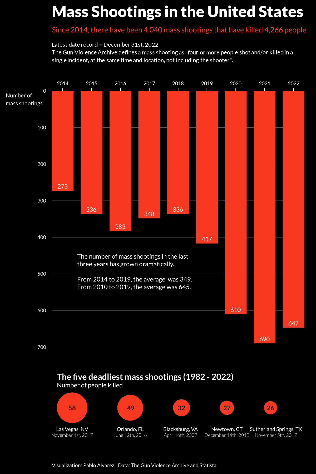 파블로 알바레즈가 만든 이 그래픽은 총기 폭력 아카이브의 데이터를 사용하여 지난 8년간 미국에서 발생한 총기 난사 사건의 수를 추적하고 최악의 상황을 목격한 주를 강조합니다.