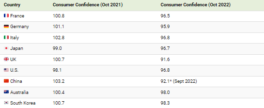 영국은 2021년 100.6이었던 소비자 신뢰 지수(CCI)가 2022년 92로 하락하면서 최악의 타격을 입었습니다.
